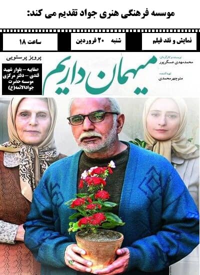 🔹نمایش و نقد فیلم " مهمان داریم"🔹فصل چهارم(سینمای جنگ)🔹جلسه یازدهم 🔹کارگردان: محمد مهدی عسگرپور 🔹بازیگران: پرویز پرستویی بهروز شعیبی آهو خردمند و... 🔹زمان: شنبه ۲۰ فروردین ماه ۱۴۰۱ ساعت ۱۸ 🔹مکان: صفائیه-بلوار شهید قندی-دفتر مرکزی موسسه جوادالائمه(ع)